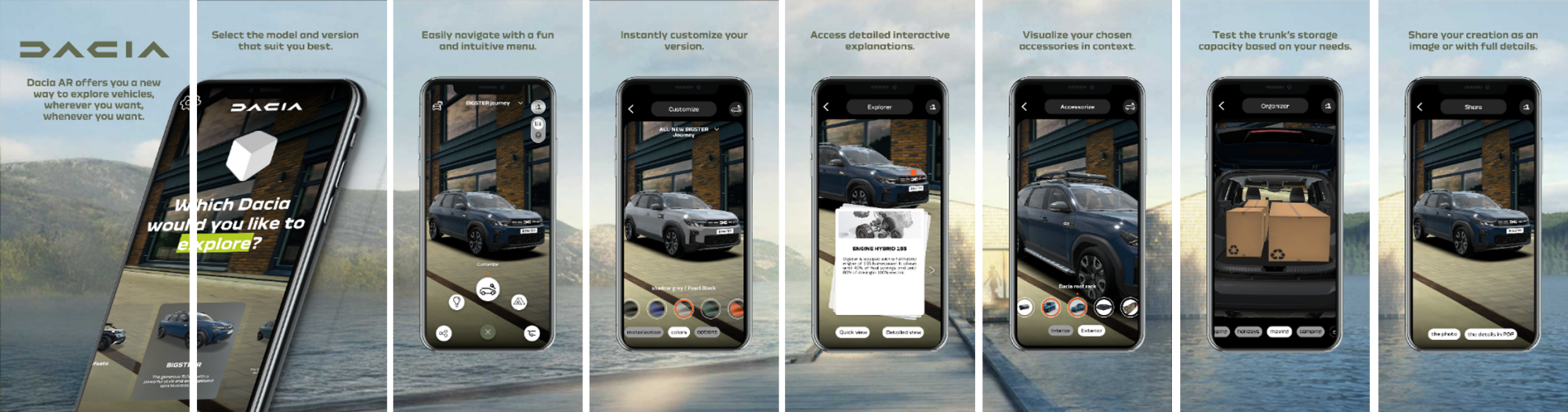 Ši inovatyvi programėlė leidžia naudotojams apžiūrėti natūralaus dydžio „Dacia“ automobilių išorę ir vidų. Savo aplinkoje galima pasirinkti spalvą, pritaikyti modeliui priedus ir itin tikroviškai tyrinėti kiekvieną detalę.