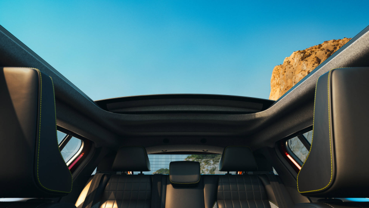 „Renault 4 E-Tech electric Plein Sud“ medžiaginį stogą pagal poreikį galima atidaryti ir užfiksuoti keliose tarpinėse padėtyse, naudojant mygtuką (ant raktelio ar šalia vidinio galinio vaizdo veidrodėlio) arba valdymą balsu su „Reno“ avataru.